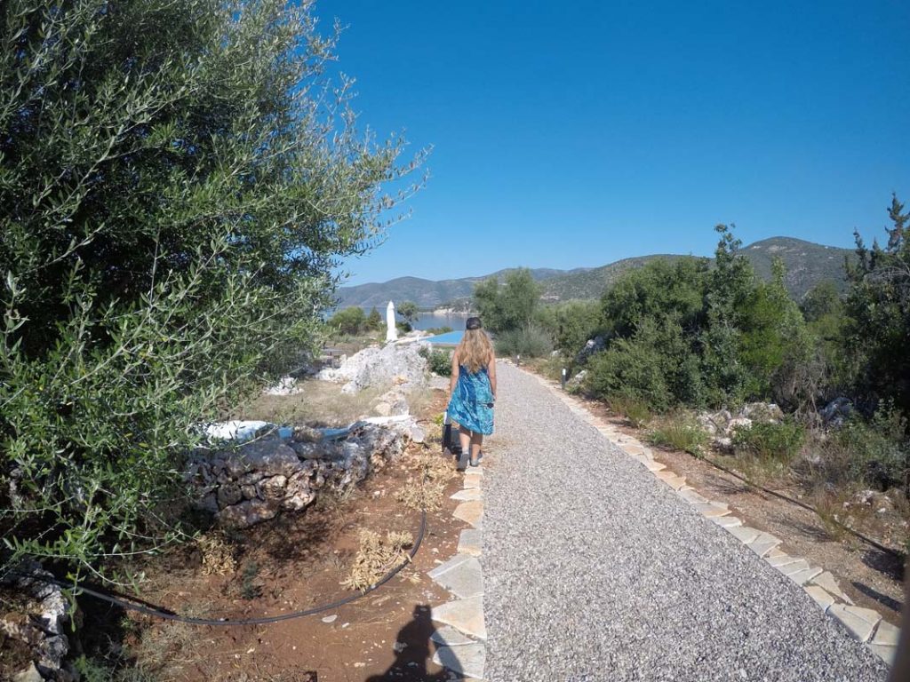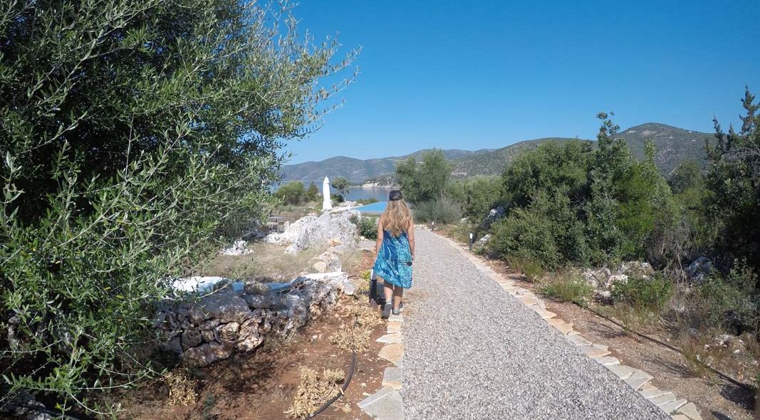 The villa is reached via a dirt road which is approximately 1,5 km from the main road. The road will lead you to the main entrance of the property, surrounded by ancient stone walls and a fence that guarantees absolute privacy and serenity. The natural stone driveway, the spacious pool area and the outdoor sitting areas are barely visible from a distance, yet the view for the guests is panoramic and captivating.